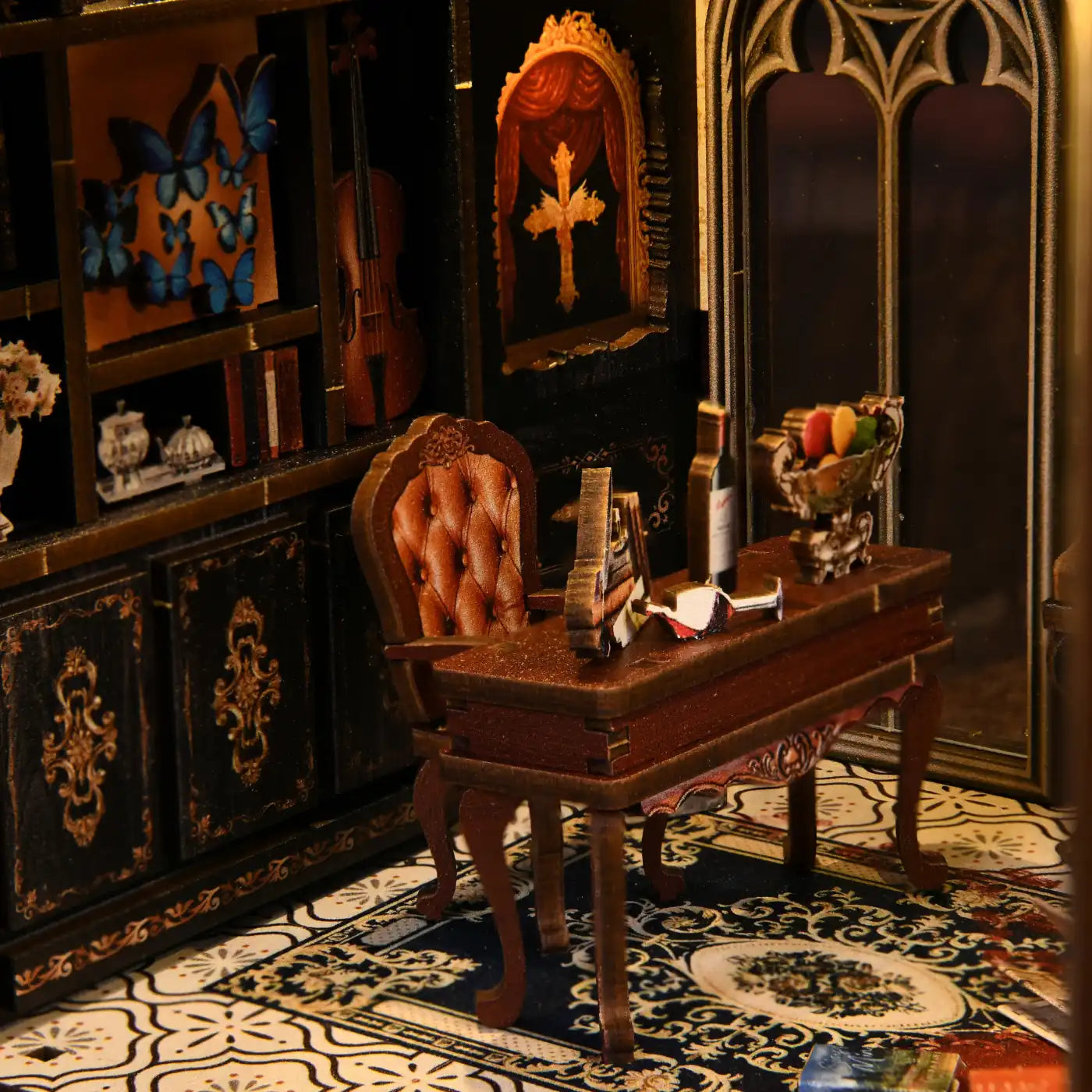 The design of Dark Box Mystery Case is based on classic detective stories set in private studies. The scene combines a ground-floor work area with piano and bookshelves and an upper-floor balcony where figures can observe a case board covered with notes and maps. Chains, framed portraits and instruments are arranged to recall the interior of a traditional investigation room. The tall, narrow layout is planned so the finished piece can stand between books on a shelf, with the illuminated interior suggesting an ongoing case inside a closed volume.