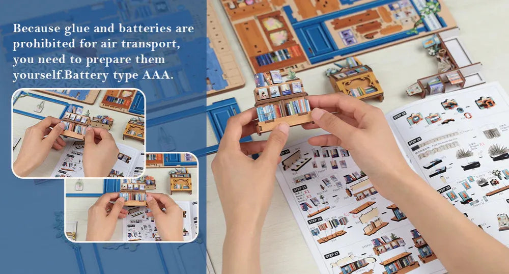 Package Included: 186 Pre-cut Wooden Pieces, Instruction Manual, Dust Cover, Paper Accessories, Battery Box & Wires, Warm Touch LED Light.